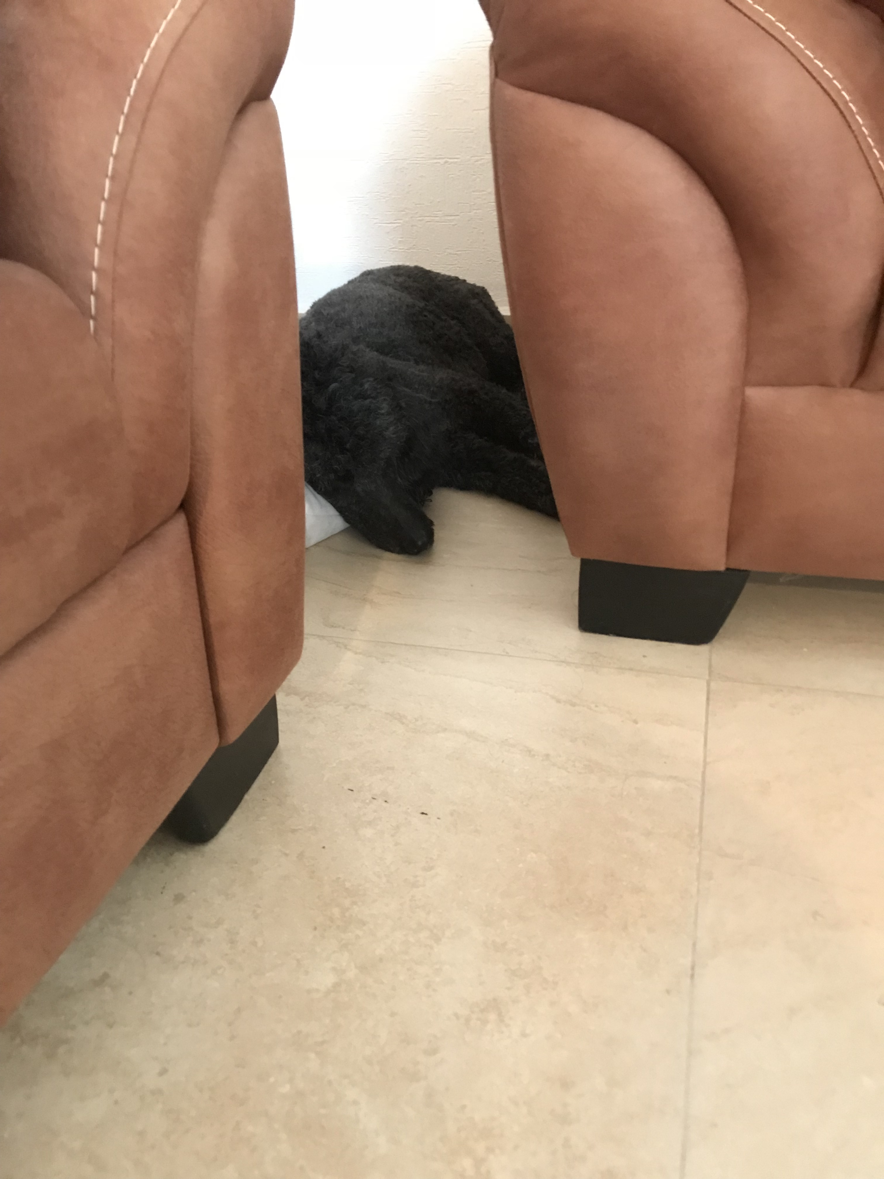 Hiding behind the sofas