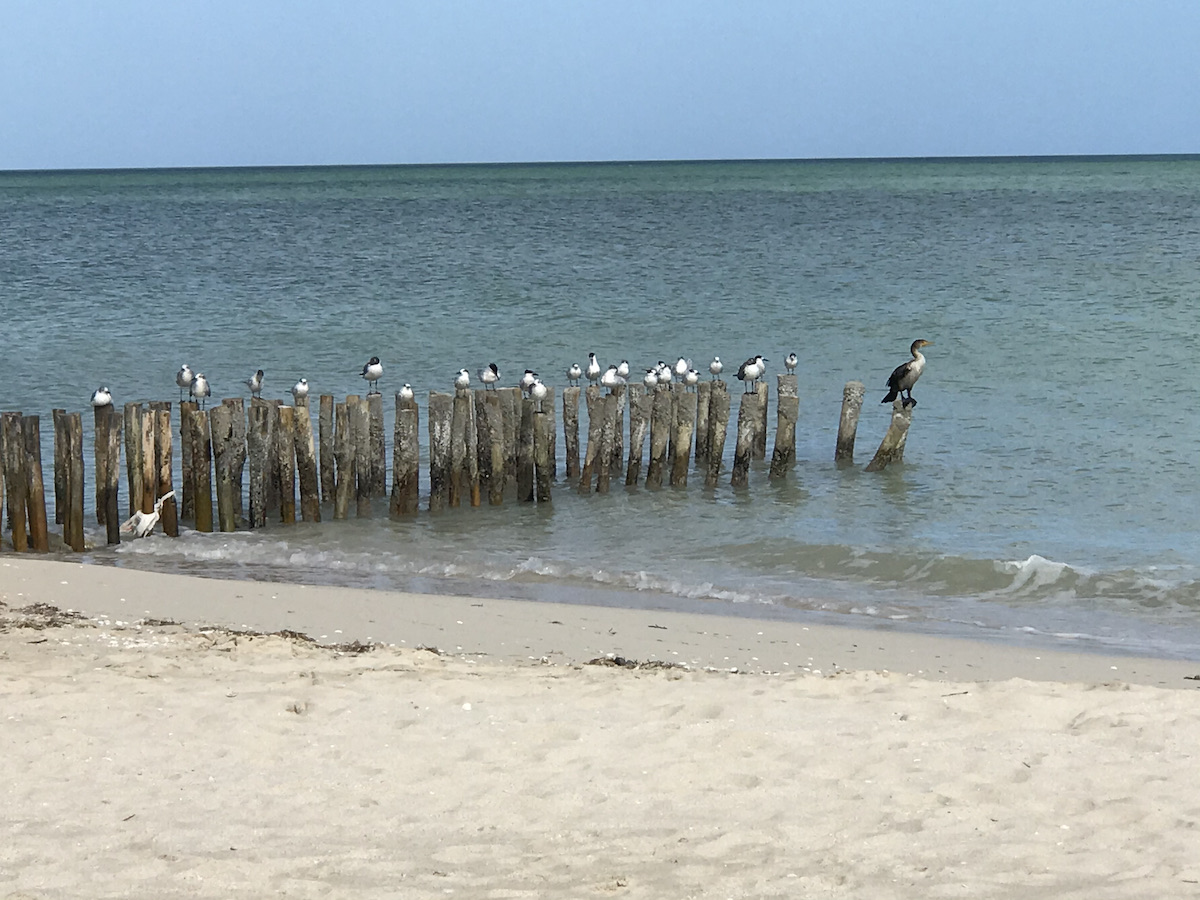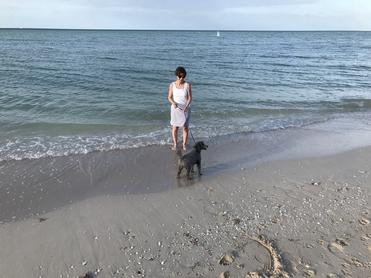 Despite it all, we have a king-sized bed in an air-conditioned room, a pool and the beach just outside the door. The gulf water is warm and the slope of the shore is gentle, so you can go quite a way out and still stand up in the water. Even Izzy is enjoying her walks on the beach, which we weren’t certain she would, as she’s never seen the beach before.