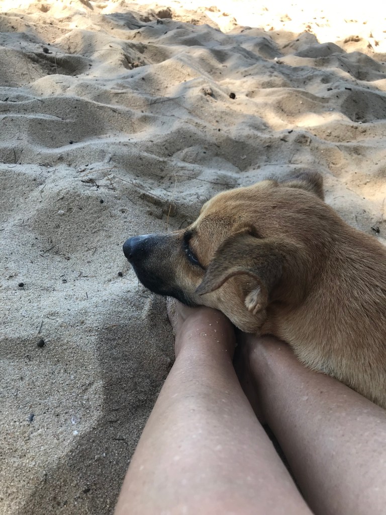 As I sat there, I received an unexpected and delightful surprise: A stray dog wandered right up to me and laid his head on my feet. He was a very sweet boy and, if I had been closer to home, I may have adopted him right then (and been quickly murdered by the husband, but hey…). I sat there with him for as long as I could handle the heat, then returned to “check out.”
